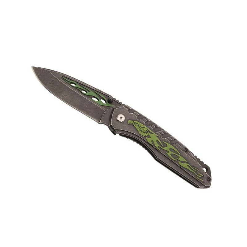 Ce couteau de poche Herbertz 568712 est doté d’un manche de 12cm de longueur en acier avec revêtement titane et décoration aigle coloris vert. De plus, le manche intègre également un clip de poche permettant de pouvoir transporter le couteau avec toujours plus de facilité au quotidien. La lame elle, est fabriquée en acier 420 à cran intérieur et à bouton double et est dotée de trous. Un couteau de poche avec motif aigle qui ravira les amoureux de la marque Allemande Herbertz !