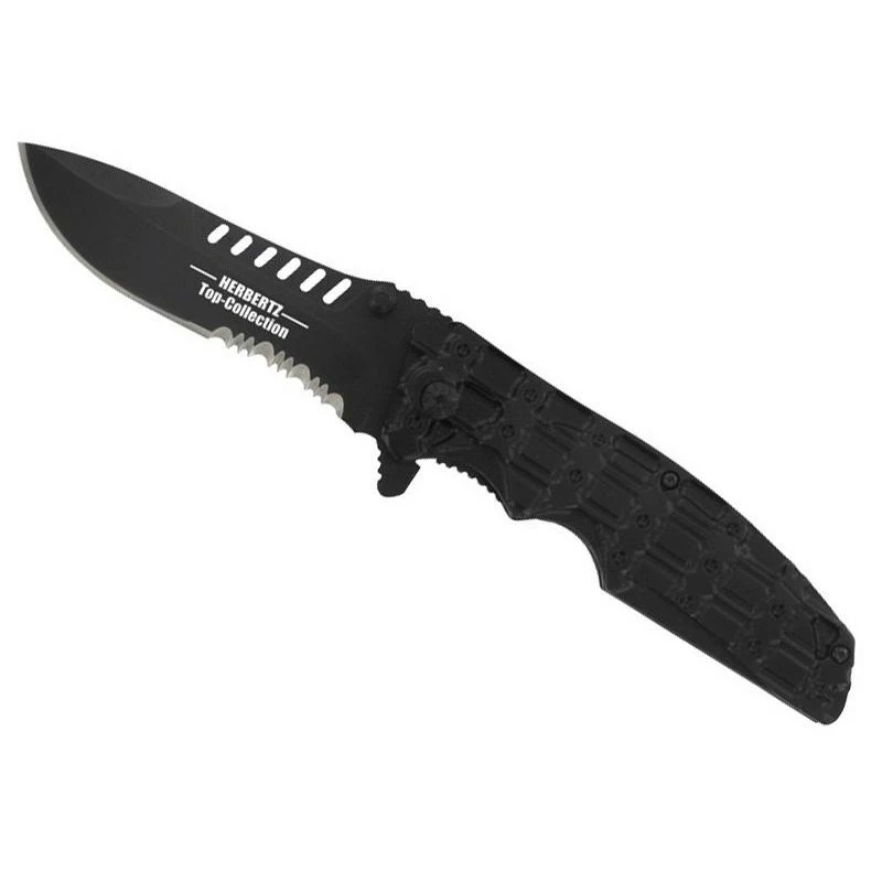 Ce couteau Herbertz Top Collection 521212 est doté d’une lame noire à trous et à dents en acier inoxydable 440 à cran intérieur et à bouton double. La lame est d’ailleurs marquée par le texte suivant inscrit en blanc : “Herbertz Top Collection“. Elle se compose exactement de 6 trous en forme de rectangles à bords arrondis : elle est visuellement très jolie et surtout très tranchante de part la présence de petites dents.