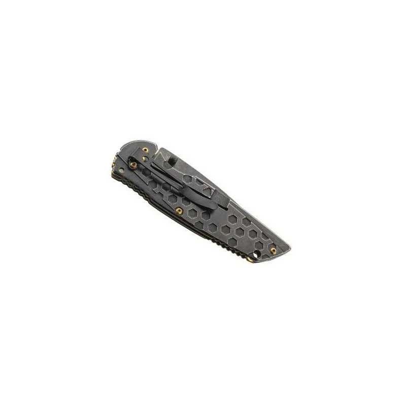Grâce à sa finition blackwash, ce couteau Herbertz 584612 dispose d’un look des plus élégants, qui plaira beaucoup à tous ceux qui aiment les couteaux sombres. Fabriqué intégralement en acier inoxydable, ce modèle est très robuste avec en vedette un manche de longueur 12cm à motifs pour la note d’originalité. Un joli manche très attrayant qui assure une transportabilité exemplaire, de même pour l’ergonomie, ou encore la prise en main si vous préférez. Pliant, ce couteau Herbertz à la finition blackwash possède aussi une lame à cran intérieur et à bouton double fabriquée en acier inoxydable 420 pour la résistance à la corrosion/rouille. De longueur 86mm, elle est discrètement décorée par le nom de la coutellerie Allemande (Herbertz) ainsi que par l’acier utilisé, ici le 420. Au design sombre et élégant, ce couteau pliant Herbertz 584612 se transportera avec beaucoup d’aisance, il faut dire qu’il intègre un clip de couleur noir au dos de la poignée.