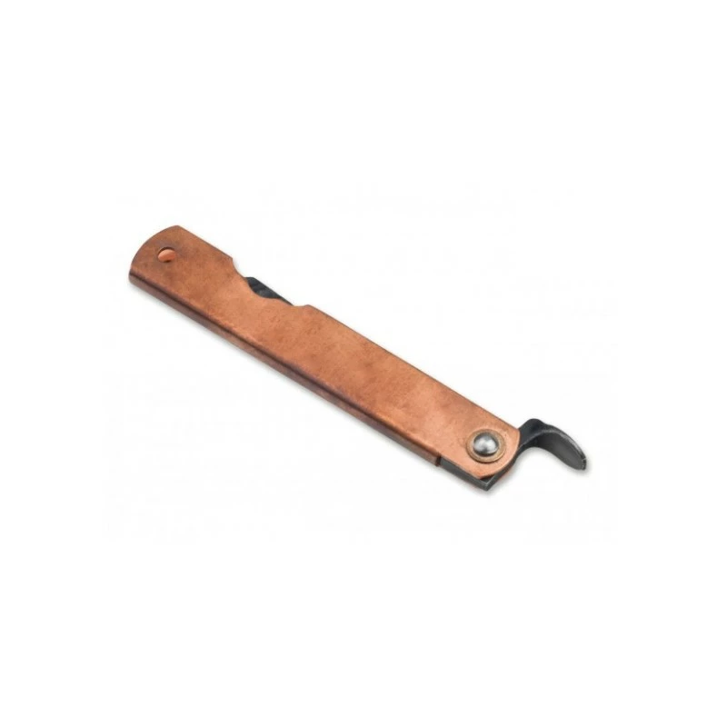 Le Higonokami Irogane Damascus, par Böker, modèle 01PE315, se dote d’un manche en cuivre qui avec le temps, aura une patine unique. Agréable à prendre en main, la poignée en cuivre mesure 91mm de long, ce qui assure une facilité de port quotidienne, à chaque instant, elle est aussi décorée par des sigles Japonais. Un passe-lacet en bout permet d’attacher, accrocher le couteau avec un fin cordon ou de la ficelle.