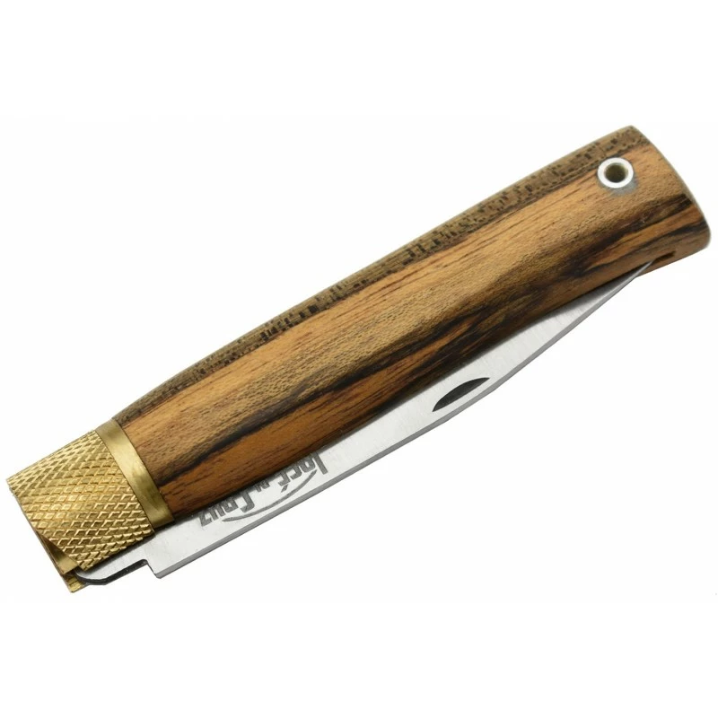 Le verrouillage de la lame carbone se fait en effectuant un mouvement rotatif de la virole en laiton moleté qui ajoute du charme supplémentaire.