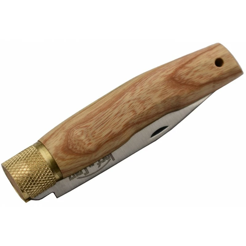 Le blocage de la lame est assuré par une virole moletée en laiton des plus élégantes. Le manche est quand à lui fabriqué en frêne, un bois clair proche du blanc, brun au niveau du cœur. D’une longueur de 105mm, ce dernier offre un transport simple au quotidien, d’autant plus qu’il intègre un passe-lacet en son extrémité. Autres déclinaisons possibles.