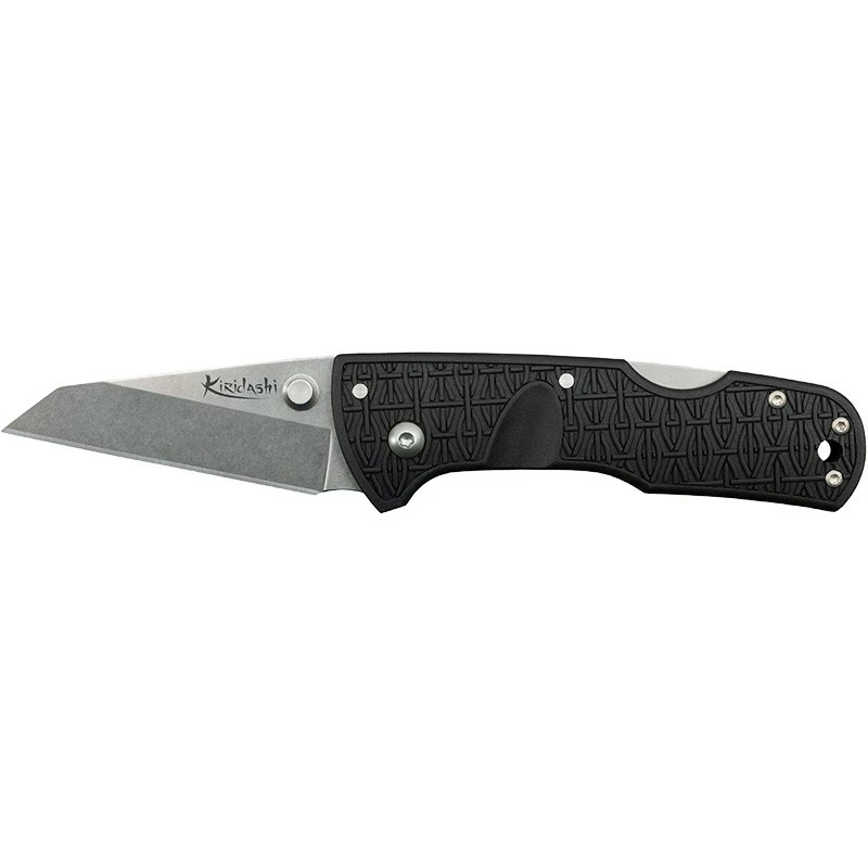 Le Kiridashi est un couteau traditionnel Japonais, utilisé par pratiquement tout le monde au pays du soleil levant. Il est utilisé pour toutes les tâches de coupe, une grande polyvalence qui séduit un public toujours plus large. Le fabricant Cold Steel a conçu la version pliante du couteau Kiridashi, en intégrant une lame de 63mm de longueur en acier inoxydable 4034SS. La lame intègre un double thumb stud (bouton de pouce) avec juste à côté la présence de l’inscription Kiridashi. N’hésitez pas à ajouter un texte via le bouton ajouter une gravure que vous trouverez plus bas. La poignée est de couleur noire, elle est fabriquée en griv-ex, un matériau plastique fortement renforcé par de la fibre de verre afin d’apporter de la solidité. Elle est décorée par des motifs rappelant le style Asiatique, Japonais. Le Cold Steel Kiridashi est un couteau facile à clipser dans la poche grâce au clip réversible, il vous accompagnera partout, sans exception, et sans difficulté ! Longueur totale : 165mm.
