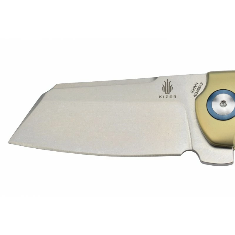 Le Mini Sheepdog C01C Kizer, modèle Ki3488A3, se remarque assez facilement pour son manche doré, ou imitation or si vous préférez, en titane anodisé, assurant ainsi légèreté et durabilité. La belle poignée est aussi ajourée à trois reprises, par un motif rectangulaire à bords arrondis, conférant ainsi une touche novatrice en terme de design. À l’allure raffinée, le manche est aussi agréable à prendre en main, il assure aussi une facilité de port en toutes circonstances grâce à son large clip doré. Avec pivot à contour bleu très décoratif.