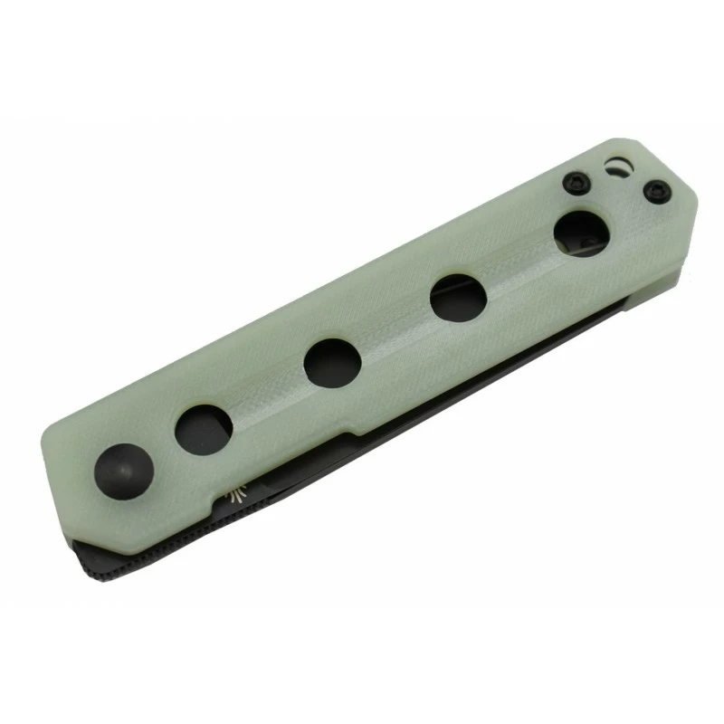 Conçu par Azo, le Kizer Converse V3595C1 est un couteau pliant EDC au look on ne peut plus original. Son manche en G10 jade semi-transparent, avec intercalaires en acier, est parsemé de trous permettant de l’alléger tout en lui apportant une note plus design. Un trou de lanière ainsi qu’un clip ceinture noir sont présents, tous deux améliorant la transportabilité. Longueur du manche : environ 10cm.