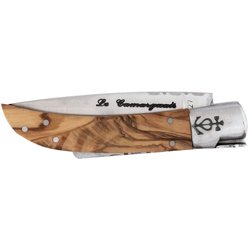 Le couteau Le Camarguais n° 10 trident soudé possède également une lame de 9cm conçue en acier inoxydable 12C27, avec verrouillage de type back lock. Une lame guillochée main, sur laquelle on peut lire l’inscription “Le Camarguais” : profil de type drop point, tranchant lisse. Possibilité de graver le texte de son choix, parfait pour offrir le couteau à quelqu’un qui adore plus que tout au monde la Camargue, cette belle région du Sud-Est de la France ! Longueur totale : 195mm.