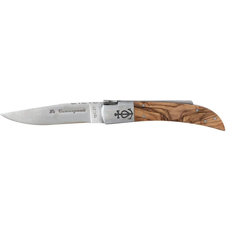 Ce modèle n° 12 est sensiblement identique au couteau Le Camarguais n° 10 trident forgé bois olivier, mais avec un gabarit légèrement plus grand. Cela commence par une lame qui mesure 105mm de longueur, toujours fabriquée en acier inoxydable 12C27 avec marquage du texte “Le Camarguais“. Comme d’habitude, il vous sera possible de graver le texte de votre choix, et ce, au niveau de la face avant mais aussi arrière. Parfait pour offrir à un habitant de la Camargue, ou quelqu’un qui adore cette région du Sud-Est de la France ! À noter que l’on peut aussi apercevoir sur la lame, le type d’acier utilisé, ici le 12C27.