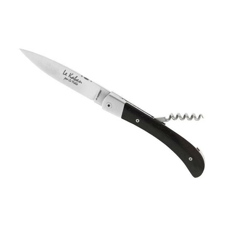 Ce couteau Le Kaban, par Laguiole Le Fidèle (artisan coutelier Français) est doté d’un manche en bois ébène de 115mm de long, avec outil tire-bouchons. Le manche est donc de couleur sombre, proche du noir, la forme est légèrement incurvée pour une ergonomie parfaite (excellent confort lors de la prise en main). C’est un couteau pliant 2 pièces qui intègre aussi une lame en acier 12C27 à cran, décorée par l’inscription Le Kaban par Le Fidèle (il est possible en supplément de graver le dos de la lame par un texte au choix). Entre la lame et le manche bois ébène, se trouve une jolie mitre en inox. Il est important de mentionner que le dos de lame ainsi que le ressort sont guillochés. Également disponible en version bois olivier (voir accessoires conseillés en bas de page). Un couteau multifonction, régional, de qualité, signé Laguiole Le Fidèle !