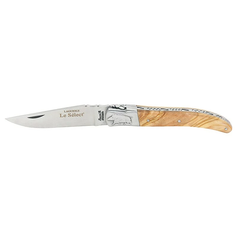 Ce couteau pliant Le Sélect forgé, par Robert David, possède un manche en bois olivier avec fine pointe en bout afin de pouvoir facilement le tenir en main. Juste à côté de la poignée, on peut observer une jolie mitre avec décoration sanglier, il y a également une mouche forgée ainsi qu’un ressort guilloché. On soulignera le fait que le manche en bois olivier, coloris clair, est sublimé par de très petits rivets, pour un maximum de style et d’élégance.