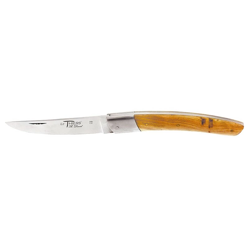 Ce couteau Le Thiers Robert David, modèle genévrier DT0212GE, est de conception fine, si bien qu’il conviendra parfaitement pour de nombreux usages du quotidien. Un couteau pliant, de fabrication 100% Française (dans le bassin Thiernois), qui comme vous l’aurez compris, se dote d’un manche en bois genévrier accompagné d’une mitre en acier inox, résistante à la corrosion/rouille. On notera la forme légèrement courbée de la poignée, conférant du style, mais surtout une prise en main agréable et confortable en toutes circonstances.