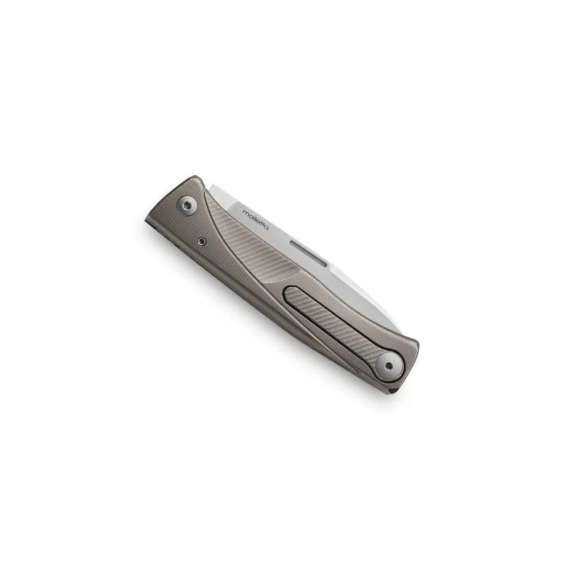 Portant la référence TL.BR, ce couteau pliant LionSteel, modèle Thrill, se voit doter d’un magnifique manche conçu en titanium 6AL4V anodisé bronze, lui donnant cette belle couleur si caractéristique. De qualité, la poignée est dite monobloc, c’est à dire taillée en centre d’usinage à partir d’une unique pièce de matière (technologie SOLID développée par la coutellerie Italienne LionSteel). À noter que le manche en titanium anodisé bronze mesure 10cm de long pour la simplicité de port, avec clip rétractable pouvant être caché dans le manche pour l’esthétique ou encore la discrétion. Cette capacité du clip à pouvoir se rétracter est due à la technologie H.WAYL.