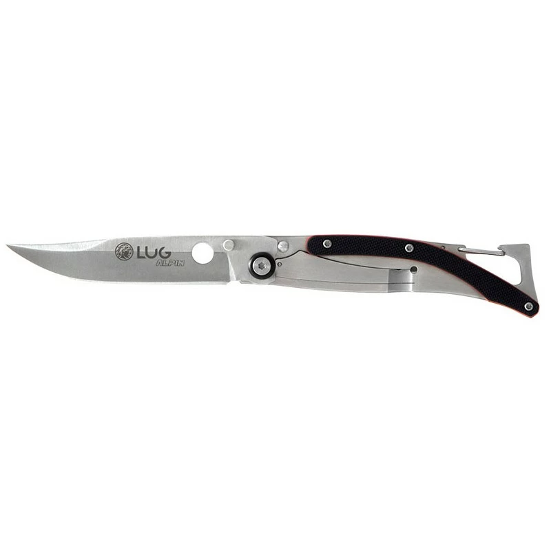Ce modèle SP1SRB de la marque Française LUG est ici pourvu d’un manche squelette en acier inoxydable gris avec une partie en G10 noir et contour rouge. La petite note colorée qui fait la différence en matière d’esthétisme ! D’une longueur d’environ 11cm, la poignée assure un transport simple et efficace du couteau pliant LUG ALPIN, il y a de plus un clip au dos ainsi qu’un mousqueton en bout.