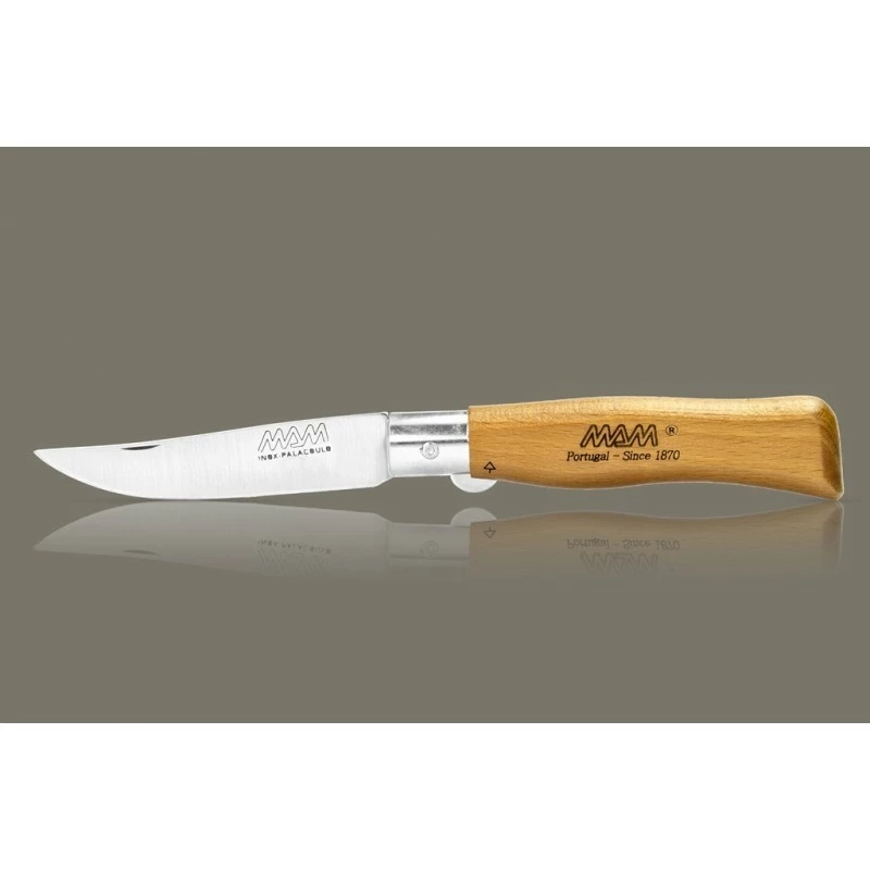 Léger, ce couteau MAM 2007 ne pèse que 49 grammes. Pourtant, il est résistant de part son manche en bois hêtre de 112mm de long qui est d’ailleurs décoré avec goût par le texte “MAM Portugal since 1870“. Agréable à prendre en main, le manche est aussi très ergonomique, de quoi pouvoir manier le couteau MAM avec aisance au quotidien. Au niveau de la lame, elle est fabriquée en acier inoxydable et mesure 90mm de long. Elle est marquée par le logo du fabricant Portugais MAM, vous pouvez personnaliser le verso contre un supplément financier.