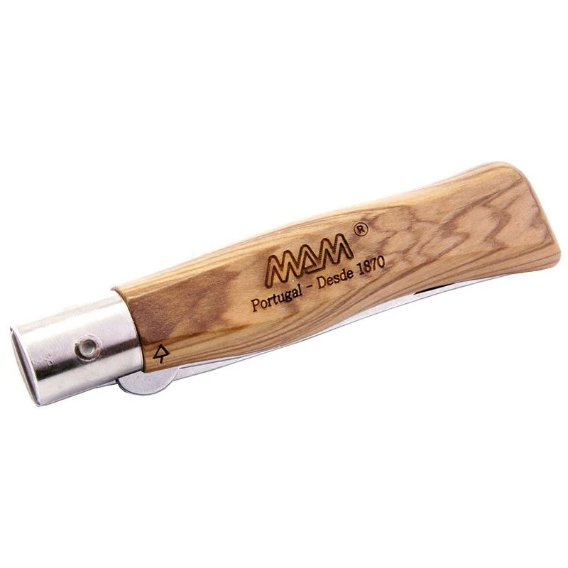 Le couteau pliant MAM Douro Grande est muni d’un manche en bois de olivier naturel spécialement traité pour résister à l’humidité. Sa forme garantit une excellente prise en main, elle mesure environ 11cm de longueur afin que le couteau puisse être rangé, transporté, sans aucune difficulté. Enrichi du logo “MAM Portugal – Desde 1870”, le manche intègre une virole en acier.