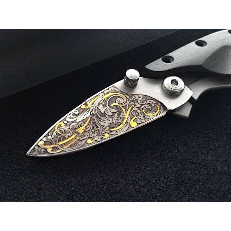 Le Maserin Onefold 550.KT est un couteau type gentleman, qui représente à lui seul l’élégance, le style. Une création du designer Moris Baroni, que l’on repère aisément pour sa courte lame en acier 440C satiné, à cran intérieur, sublimée par une gravure en or 24 carats, déposée à l’aide d’un procédé électrochimique. Tout cela permet de créer un motif juste magnifique, qui attire l’œil par ses nuances dorées. Une lame certes très esthétique, mais qui ne manque pas de tranchant, bien au contraire !