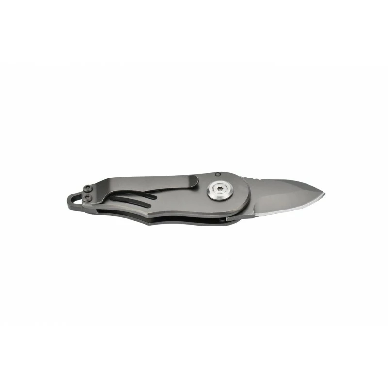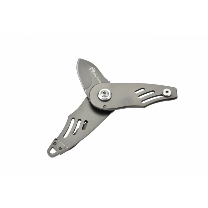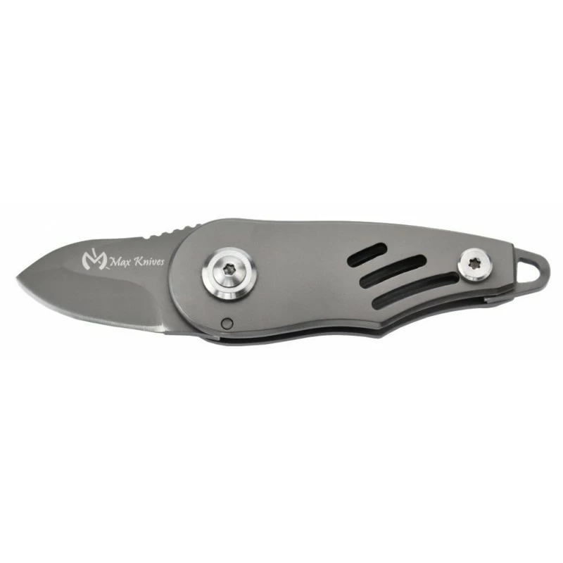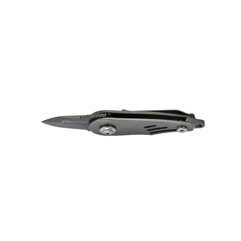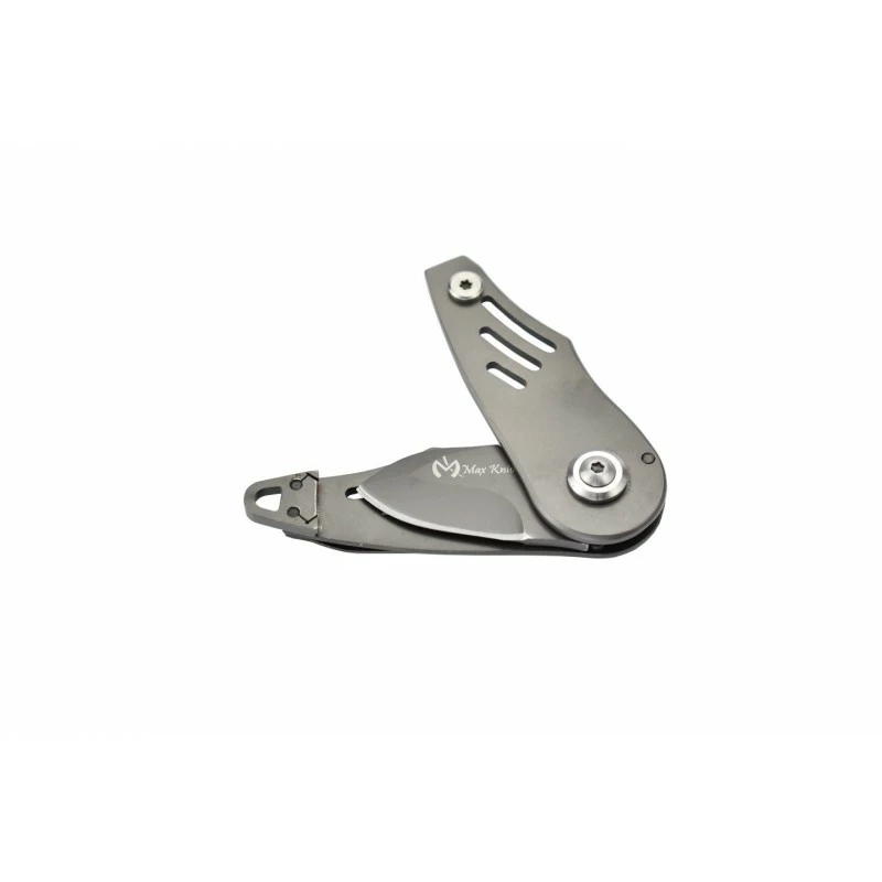 Le Max Knives 14693T, modèle Small Flip rotatif, est un petit couteau pliant entièrement fabriqué en acier inoxydable 440C, et comportant une très belle finition titane. La courte lame de 3cm de long est décorée par le logo Max Knives en blanc, avec inscription, elle peut être gravée par un très court texte (voir bouton ajouter une gravure). Le manche lui, mesure 77mm de long, ce qui permet de facilement ranger le mini couteau Max Knives 14693T dans une poche ou dans un sac, il y a de toute façon un clip de ceinture pour un port à la poche, à la ceinture. On précisera le fait que le manche est ajouré à trois reprises par des motifs traits, de tailles diverses.