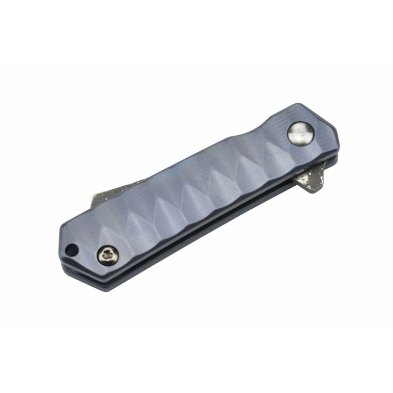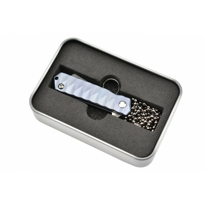 Le couteau Max Knives MK153 possède aussi un manche en titane TC4 assurant énormément de résistance au quotidien. D’un coloris gris/bleuté, il tient bien dans la main et intègre des textures pour le style, le côté design. Longueur du manche titane : 56mm, ce qui garantit une facilité de port à chaque instant, d’autant plus qu’un anneau et une chaînette à billes en métal seront fournis (porte-clés ou tour de cou). Un mini couteau de poche à l’apparence sophistiquée, avec lequel vous pourrez accomplir de grandes choses !