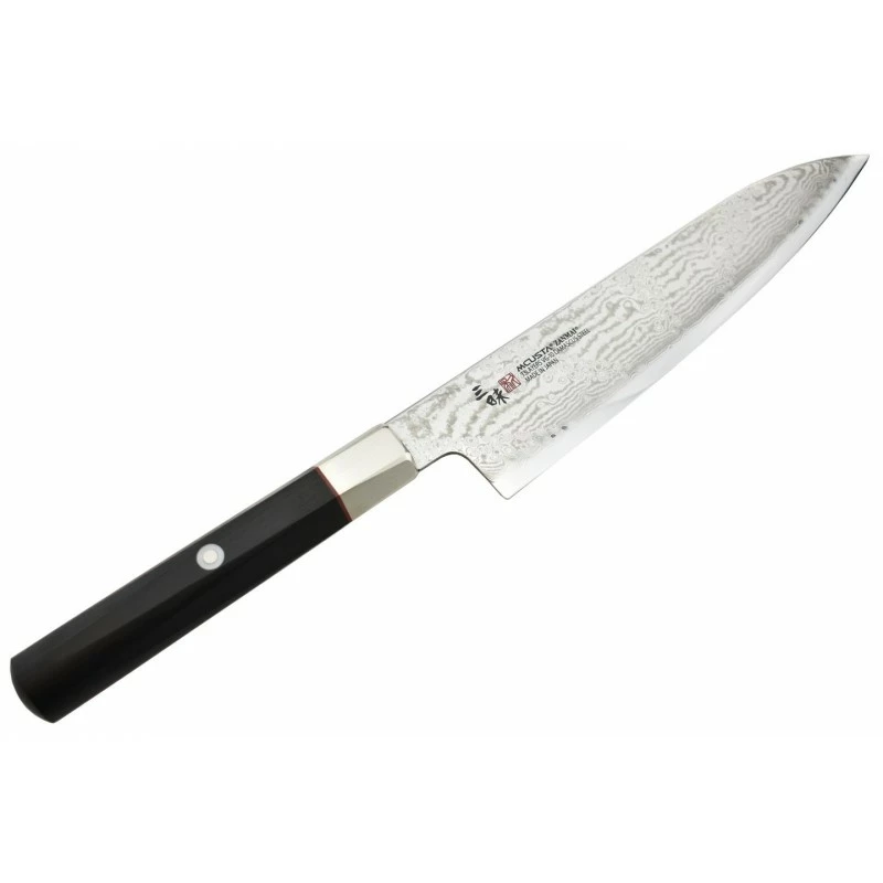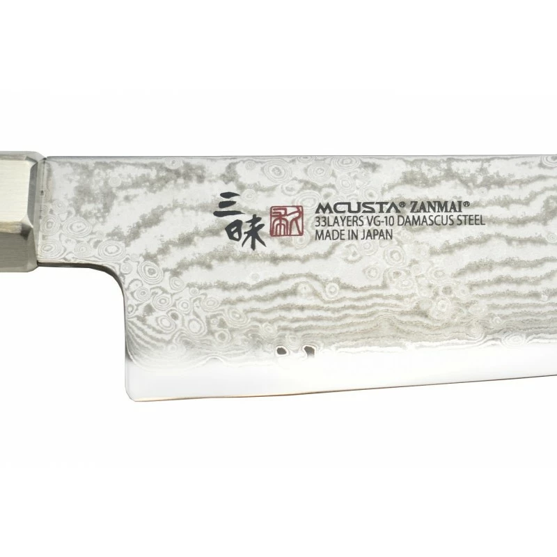 Issu de la série HZ2 Splash Hybrid, ce couteau de cuisine Japonais Gyuto est conçu et fabriqué par la marque Mcusta. Sa lame de 18cm de longueur est remarquable, tant sur le point des performances que l’esthétique. Elle comprend un noyau en VG-10 tranchant entouré par 33 couches de damas que l’on identifie facilement par ses beaux motifs attrayants. Au profil ogive et au tranchant symétrique, la lame est embellie par le logo Mcusta Zanmai ainsi que le type d’acier ou encore le pays de fabrication (Made in Japan). Son manche est fait de pakkawood noir stabilisé et intègre une mitre en alliage nickel-argent qui complète l’ensemble à merveille. Ce couteau Gyuto Mcusta HZ2-3004DS Splash Hybrid est époustouflant sur tous les plans, et conviendra pour tous les cuisiniers, chefs de cuisine. Une valeur sûre qui ne vous décevra jamais, un must pour la polyvalence en cuisine, pour la découpe des viandes, poissons, légumes et fruits.