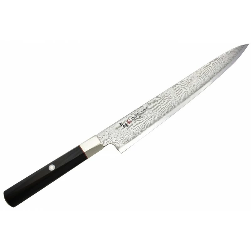 Ce couteau de cuisine Japonais est fabriqué par Mcusta, une marque au savoir-faire incroyable, et ce, depuis de nombreuses années. Ce modèle HZ2-3011DS appartient à la série Splash Hybrid, c’est un couteau de cuisine de type Sujihiki. Il s’agit d’une alternative au Yanagiba que vous connaissez peut-être. Ce type de couteau convient parfaitement pour la découpe précise et minutieuse des poissons ainsi que des viandes. La grande lame de 27cm de longueur est fidèle à la tradition Japonaise Mcusta, avec un cœur en VG-10 entouré par des couches d’acier damas. Le tranchant est de type symétrique, le profil ogive et la finition polie miroir. Les motifs Sanmai feuilleté ne manquent pas d’apporter une touche décorative très appréciée des cuisiniers. Évidemment, il va de soi qu’elle nécessite du soin lors de ses utilisations, veillez à ne pas couper des surgelés ou os !