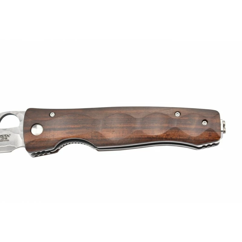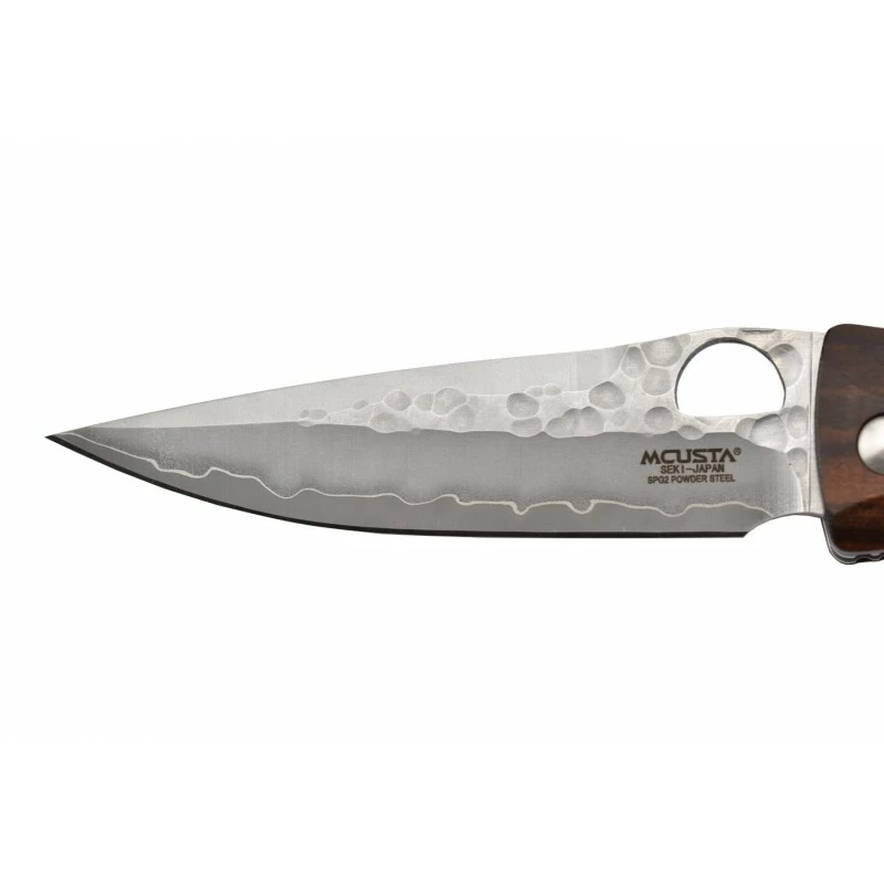 Voici la version SPG2 du couteau Japonais Mcusta Ironwood ! Un modèle qui intègre une lame en acier inoxydable SPG2 avec partie supérieure martelée : un acier novateur aux performances tout simplement excellentes ! De longueur 93mm, la lame en acier SPG2 est ajourée d’un trou pour faciliter l’ouverture, on peut apercevoir juste en-dessous le logo de la coutellerie Japonaise Mcusta. Un excellent tranchant ainsi qu’un design remarquable ! Le couteau Mcusta MC-125G Ironwood, c’est aussi un manche conçu en ironwood, un matériau design réputé pour son incroyable solidité. Le manche a l’avantage d’être relativement compact avec une longueur de 115mm, cela permet de pouvoir transporter encore plus facilement le couteau Mcusta MC-125G Ironwood SPG2. À noter que les finitions sont réalisées à la main, un couteau Japonais de très grande qualité !