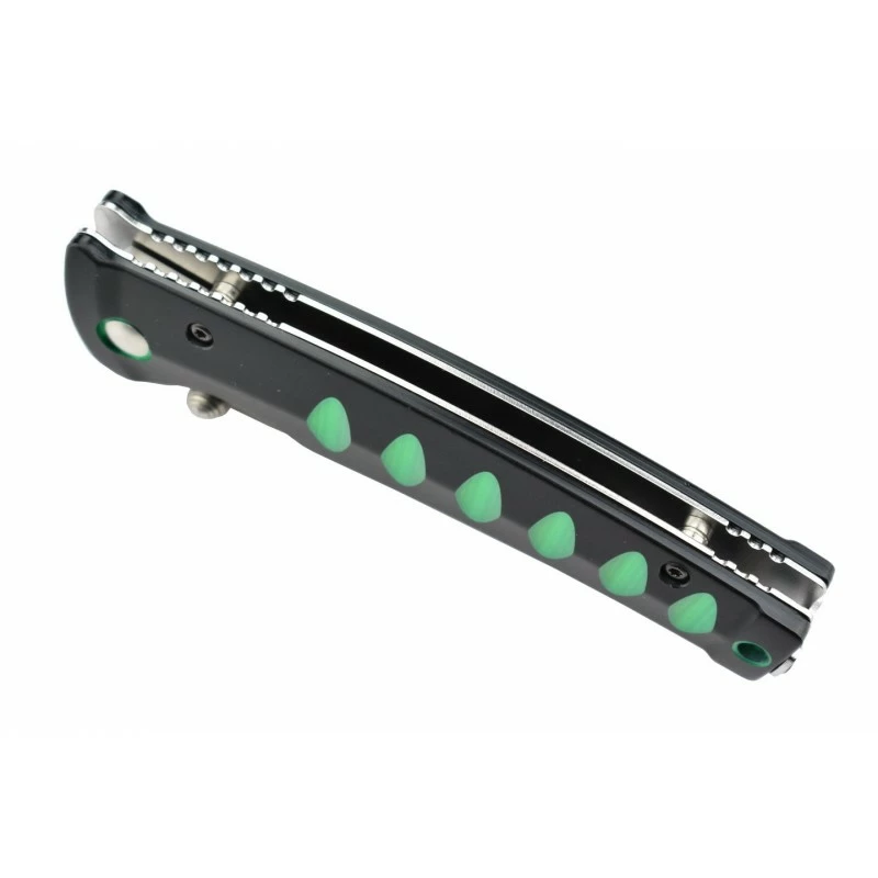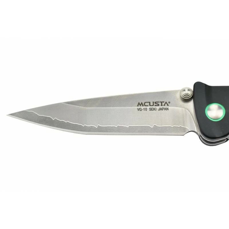 Le couteau pliant Mcusta Katana MC-44C intègre aussi une lame de 89mm de longueur, en acier VG-10 Clad San Mai. Une lame à bouton double, qui fonctionne sur des rondelles en téflon, ce qui assure énormément de douceur lors de son ouverture. À noter que la lame est décorée par le logo Mcusta, avec juste en-dessous l’inscription suivante : “VG-10 Seki Japan“. Sur ce modèle Katana vert/noir, le verrouillage est de type liner lock, un mécanisme très utilisé en coutellerie. Le thumb stud assure une ouverture rapide et aisée de la lame, en plus de procurer un aspect décoratif.