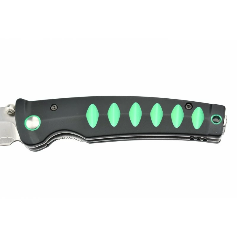 Conçu et fabriqué à Seki au Japon, ce couteau Mcusta MC-44C appartient à la série Katana. Il comprend un très joli manche en aluminium anodisé, coloris noir, avec des accents anodisés vert turquoise conférant la touche originale, hyper élégante, qui fait la différence en matière de design. La belle poignée dispose aussi d’un trou pour lanière, ainsi qu’un clip ceinture rabattable à une position rendant la transportabilité très bonne, pour ne pas dire excellente.
