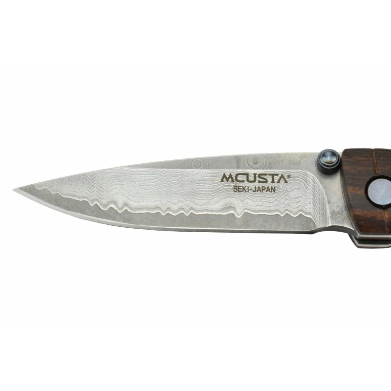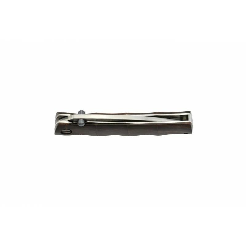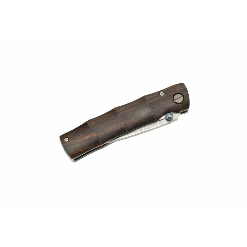 Avec le modèle MC-74DI Take, la marque Japonaise Mcusta montre une nouvelle fois ce dont elle est capable. Ce couteau pliant à mécanisme de verrouillage liner lock est d’une beauté incroyable. Son manche est conçu en ironwood ou encore bois de fer si vous préférez en raison de sa forte dureté. Mesurant 94mm de long, il est très esthétique en raison de sa forme rappelant celle d’un bambou. Cette beauté ne vient pas gâcher son ergonomie : le confort de prise en main est au rendez-vous. Le couteau Mcusta MC-74DI Take est aussi très élégant grâce à sa lame Damas San Mai mesurant 71mm de long. Elle est décorée par le logo Mcusta ainsi que par le lieu de fabrication (Seki Japan), un double thumb stud vous permet de l’ouvrir de façon plus aisée. Il s’agit simplement d’un bouton de pouce situé de part et d’autre de la lame damas. Le couteau Mcusta MC-74DI est livré dans un étui tissu Japonais ce qui apporte de l’authenticité en plus d’une note originale.