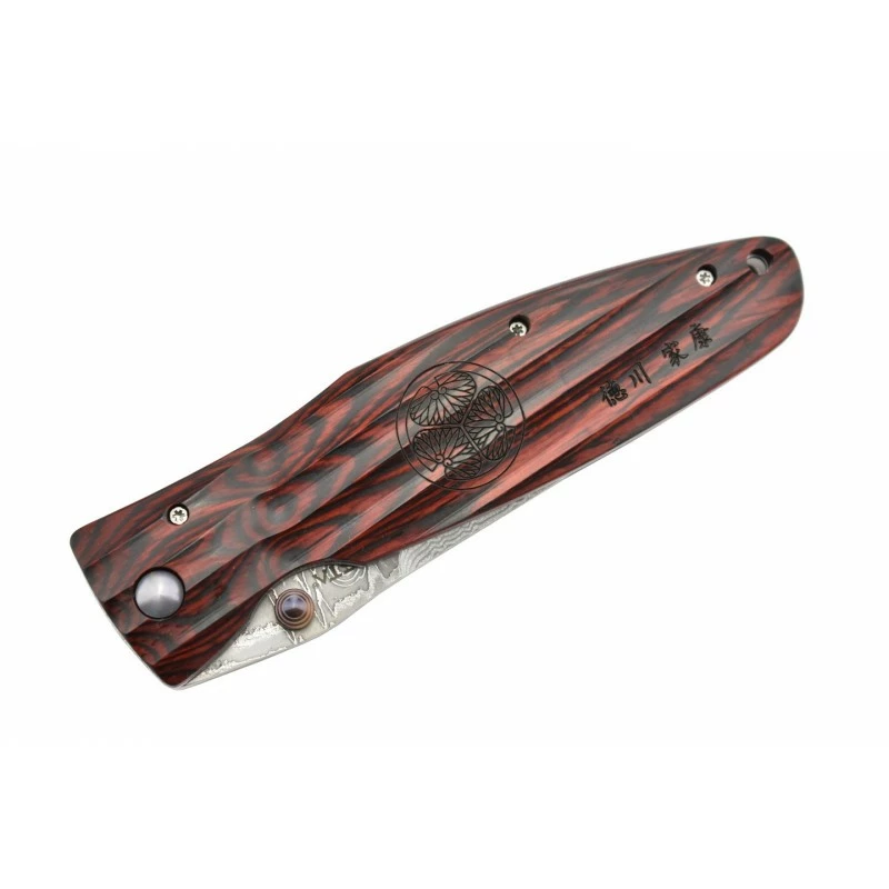 Ce couteau pliant Mcusta MC-183D possède aussi un manche en pakka wood rouge, rainuré, sur lequel on observe un beau motif traditionnel Japonais. À noter que des sigles Japonais sont également de la partie, renforçant davantage le caractère authentique du couteau. Le passe-lacet situé en bout de poignée garantit une facilité de port en toutes circonstances, le manche ne mesure, de toute façon, que 118mm de longueur. Le Mcusta Sengoku MC-183D est un couteau de poche à verrouillage liner lock.