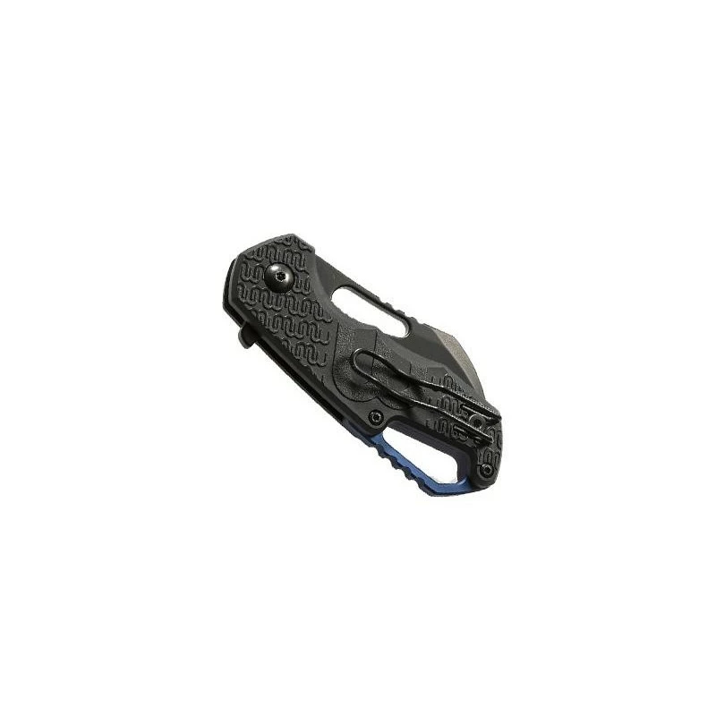 Le couteau MKM Isonzo Fox Knives FX031PBK dispose aussi d’un manche de 9cm fabriqué en FRN noir, un matériau qui associe du nylon à de la fibre de verre pour du style, de la légèreté et de la robustesse ! Facile à glisser n’importe où, notamment dans une poche, le manche est aussi très élégant en raison de son pivot ainsi que son entretoise en aluminium anodisé bleu, un coloris qui se marie parfaitement bien avec le noir du couteau. Un modèle qui ne passera pas inaperçu, c’est une certitude ! Il faut aussi mentionner la présence d’un large trou dans la poignée faisant office de trou pour lanière ou pour mousqueton. Avec clip.
