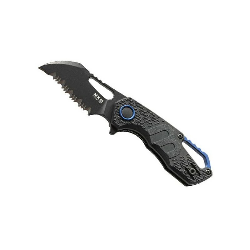 Le couteau MKM Isonzo par Fox Knives, référence FX031PBK, est doté d’une lame noire dentée, de forme hawkbill, en acier N690Co, idéale pour la découpe de cordes, cartons, matériaux fibreux … De petite taille (49mm), la lame se révèle pourtant très tranchante, elle intègre un flipper, le mécanisme ball bearing ainsi qu’un cran intérieur. Elle possède aussi un gros trou pour pouce, on peut apercevoir le logo MKM en blanc qui ressort parfaitement, ainsi que le texte VOX en référence au designer (Jesper Voxnaes). Épaisseur de la lame : 3mm.