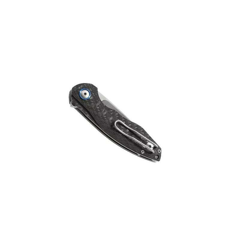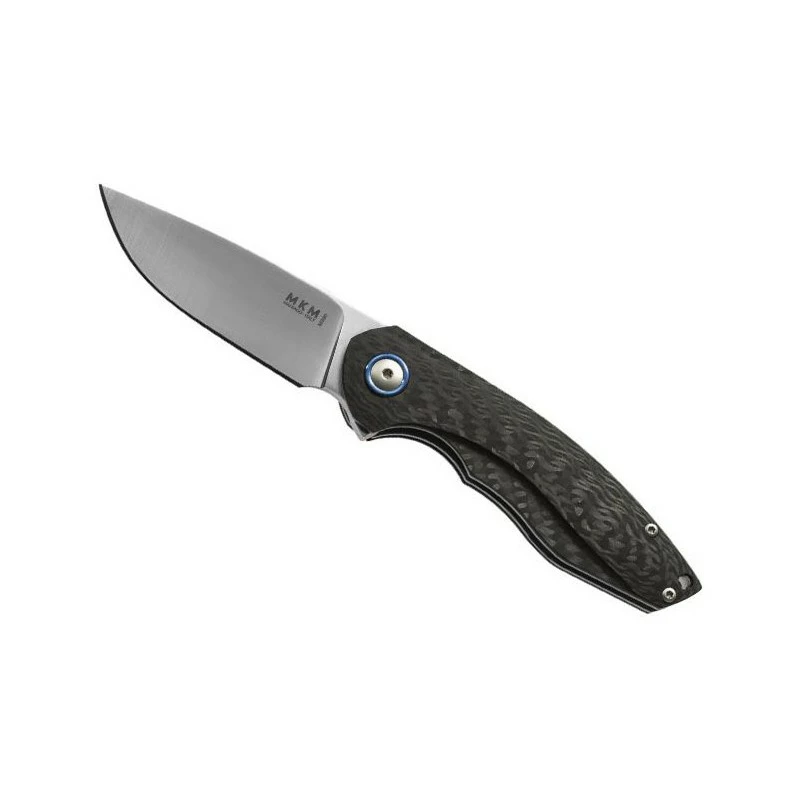 Ce couteau pliant MKM Timavo signé Viper, référence VP02C, correspond à la version manche en fibre de carbone. Toujours conçu par l’excellent designer Jesper Voxnaes, ce couteau EDC est comme vous l’aurez compris, doté d’un manche noir en fibre de carbone, avec pivot en titanium anodisé bleu, entretoise et clip en acier inox. Même s’il n’a l’air de rien, le pivot à contour bleu apporte de la gaieté, ou encore du modernisme au couteau. La prise en main reste extrêmement confortable, et la transportabilité elle aussi excellente avec une longueur de 105mm en position fermée.