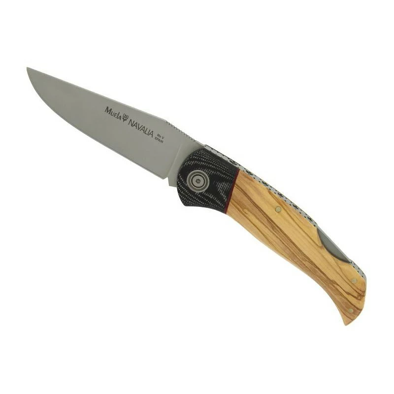 Le Muela Navalia 9357 est un couteau pliant conçu et fabriqué en Espagne. Sa particularité, c’est son manche de 12cm fabriqué en bois olivier, avec mitre en micarta et ressort ciselé. Toute l’originalité provient du micarta car c’est un matériau rarement utilisé pour la fabrication des mitres. Avec tout ça, le manche dispose d’un look remarquable qui ne passera pas inaperçu. Il faut aussi préciser que la prise en main est excellente, il en va de même pour la transportabilité. Le couteau de poche Muela Navalia, ce n’est pas qu’un manche original, c’est aussi une grande efficacité de part la présence d’une lame à cran en acier inox X50CrMoV15 (teneur en carbone 0,5%, en chrome 15%). Une lame sur laquelle est marquée le logo Muela avec juste à côté le nom du couteau, à savoir le Navalia. Il est toujours possible de personnaliser la lame au niveau des deux faces (voir bouton ajouter une gravure ci-dessous).