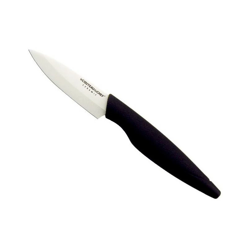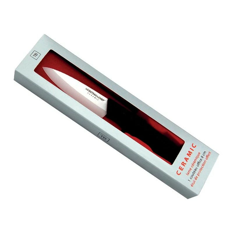 Ce couteau d’office TB dispose d’une lame de 8cm de longueur en céramique blanche, où l’on peut d’ailleurs apercevoir l’inscription suivante : “le couteau du chef Ceramic“. Une lame très dure, qui ne rouille pas, et qui ne nécessite pas d’affûtage, qui permettra de trancher de façon nette les fruits et légumes. L’avantage de la céramique, c’est qu’il s’agit d’un matériau qui ne transmet pas d’odeur aux aliments, il sera ainsi possible de passer d’un légume à un autre juste après un simple rinçage.