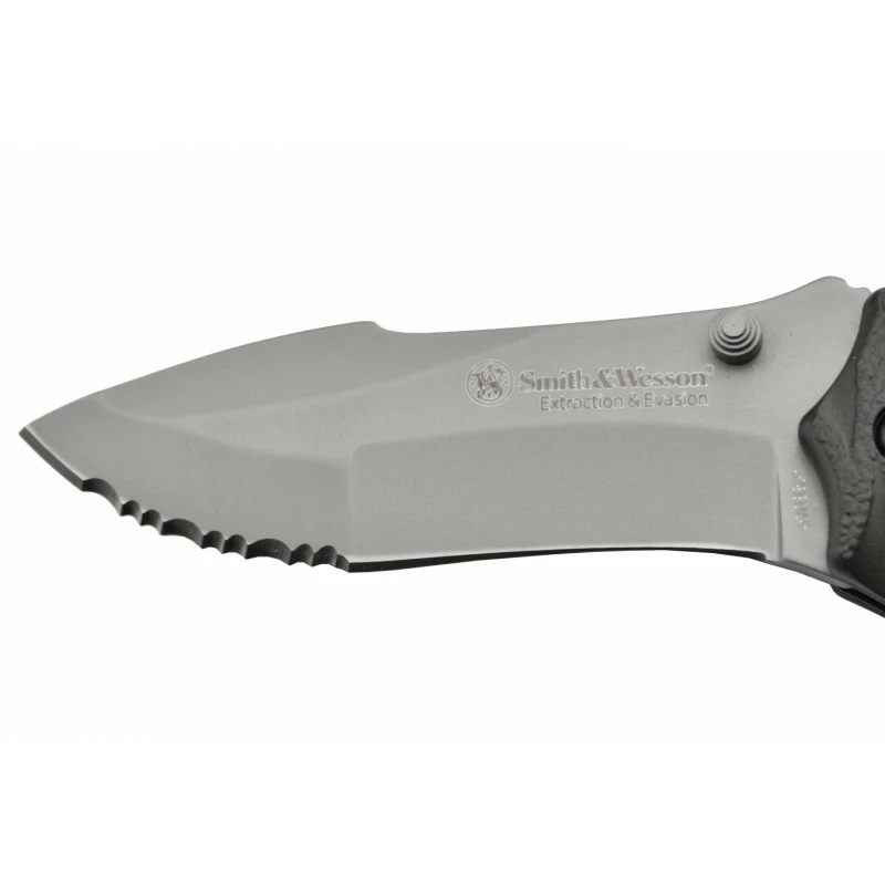 Le Smith & Wesson SWEE3S Extraction and Evasion est un couteau pliant à ouverture assistée d’une grande efficacité. Sa lame de 85mm de longueur, construite en acier 4034 à la finition silver, pourra être déployée à la vitesse de l’éclair via le flipper ainsi que le double thumb stud. Comportant un bord lisse ainsi que denté, la lame est très polyvalente, elle est également enrichie du marquage de l’inscription “Smith & Wesson Extraction & Evasion”. À verrouillage liner lock, la lame peut être gravée par le texte de votre choix en supplément, et ce, au niveau des deux faces.