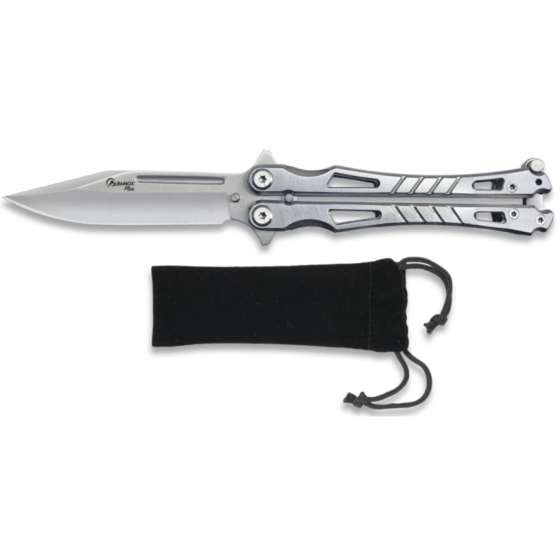 Un design sobre et hyper élégant pour ce couteau papillon Martinez Albainox Plus 02172 ! Il est fabriqué intégralement en acier inoxydable, que ce soit au niveau de la lame de longueur 96mm ou du manche avec ajours. Cela lui vaut une excellente résistance face à la rouille, la corrosion ainsi que l’usure du temps. À noter que la lame est décorée par le logo Albainox Plus (fabricant Espagnol) : elle peut être personnalisée par gravure sur les deux faces (avant/arrière). Le manche en acier est lui, décoré par quatre traits obliques ainsi que 4 ajours de formes géométriques pour une élégance de tous les instants. Le plus de ce couteau papillon Albainox 02172, c’est qu’il intègre un clip ceinture pour une facilité de transport au quotidien. Et pour ne jamais abîmer votre balisong préféré durant les déplacement/mouvements, vous pourrez toujours compter sur un étui en velours noir comme vous pouvez le voir sur l’image du produit.