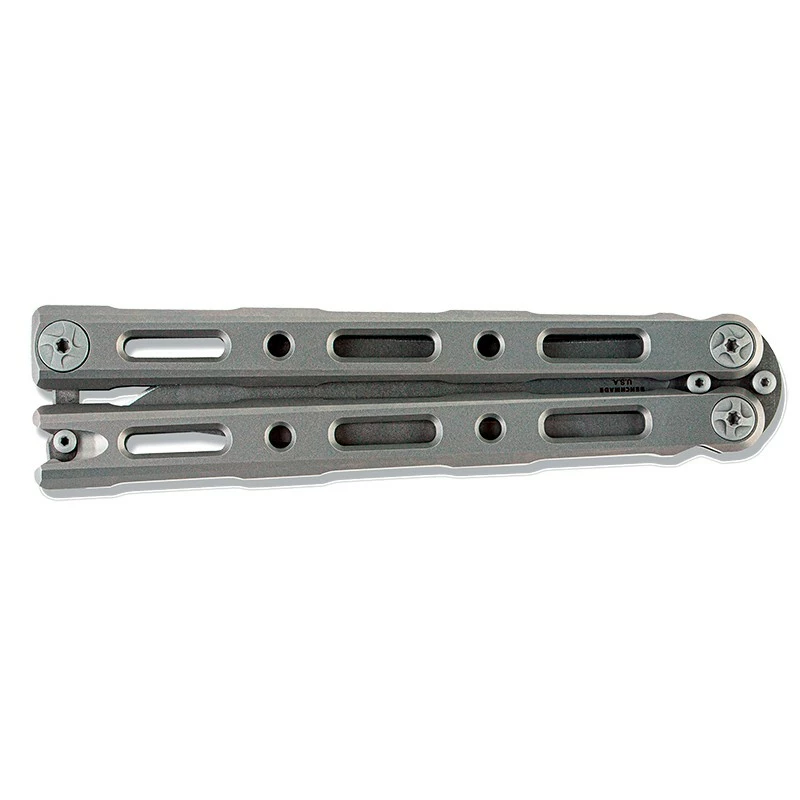 Le couteau papillon Billet Ti Balisong, par Benchmade, modèle BN85, possède également une lame au tranchant lisse de 112mm de longueur, en acier CPM-S30V pour une dureté de 58-60HRC. Très pointue en bout, la lame est ajourée pour une parfaite harmonie avec le style de la poignée, on peut aussi observer dans le coin inférieur le logo Benchmade. Possibilité de personnaliser la lame par gravure, pour rendre unique ce couteau papillon exceptionnel !