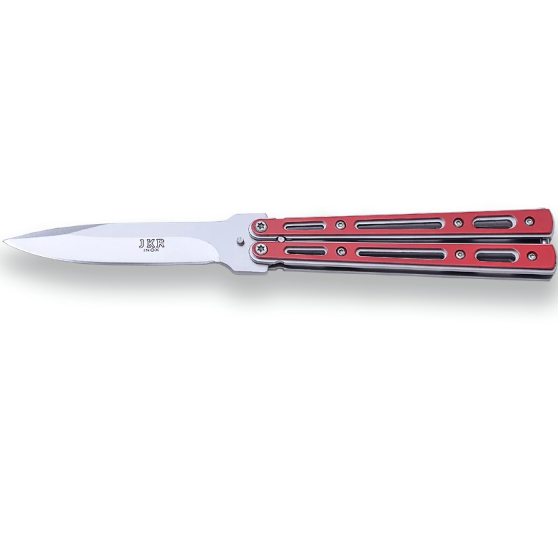 La particularité du couteau papillon Joker 484 réside dans son manche troué de couleur rouge. La lame de 10 cm est en acier inoxydable. La construction entièrement en acier et l’assemblage de la lame avec des vis rendent ce papillon parfait pour les tricks. Les vis de construction vous permettent de personnaliser le balisong en fonction de vos préférences et d’un éventuel serrage lors de l’utilisation.