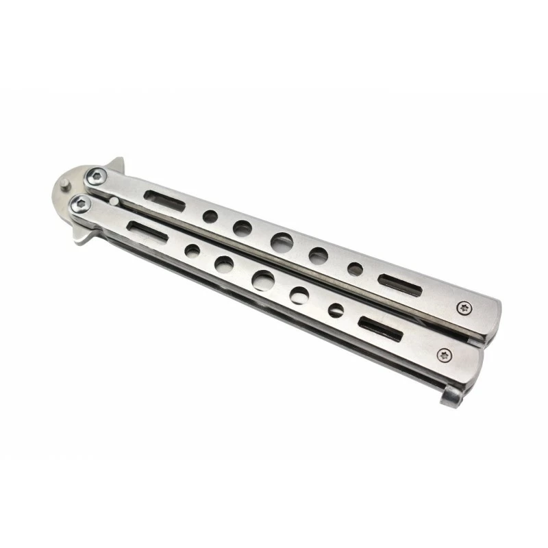Conçu intégralement en inox, ce couteau papillon Max Knives P39S se dote également d’un manche de 122mm de long, se séparant en deux parties comme n’importe quel balisong. Une poignée qui s’avère être confortable à manipuler, et qui est très belle en raison de ses multiples ajours, essentiellement ronds, mais aussi rectangulaires. Des décorations très harmonieuses, rendant le manche du Max Knives P39S très élégant. L’épaisseur de la lame est de 3mm.