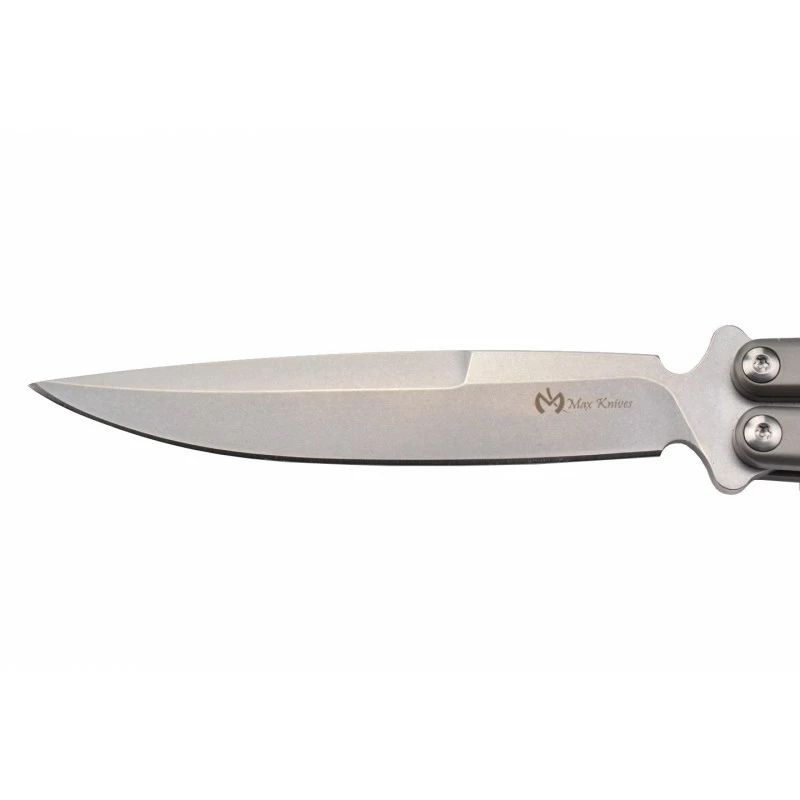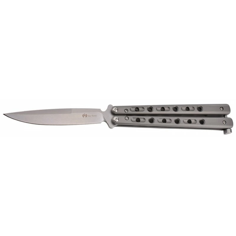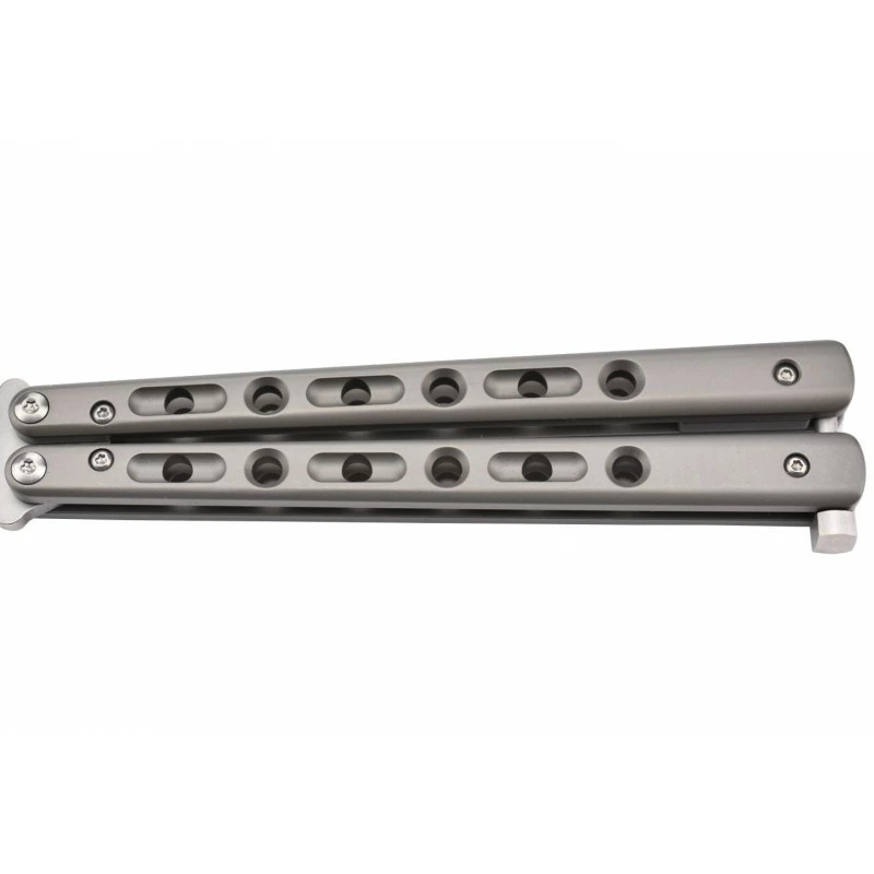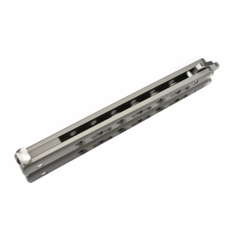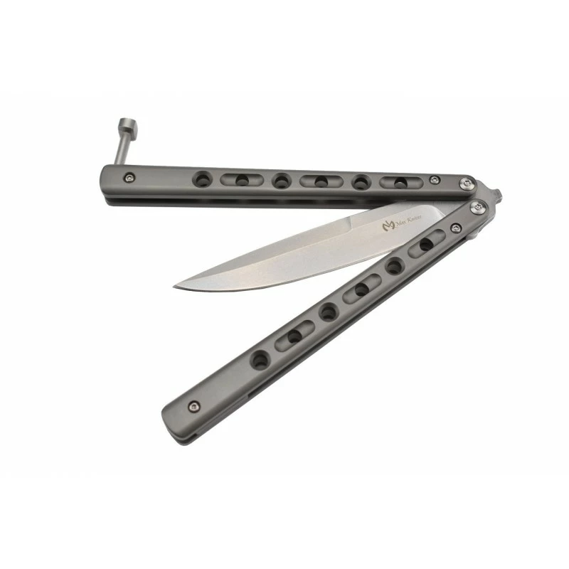 Le Max Knives P40S est un couteau papillon, dit balisong, de très haute qualitĂ©. Pour s’en rendre compte, il suffit d’observer son manche en titane gris, qui se sĂ©pare en deux parties. EsthĂ©tique, il est dĂ©corĂ© par de nombreux ajours et confère une prise en main très confortable Ă l’utilisateur. Pour information, il mesure 138mm de long ce qui ajoute une facilitĂ© de transport supplĂ©mentaire.