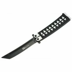 Le Max Knives P46B est un couteau papillon plein de charme et d’inspiration japonaise. Son manche est de forme courbée, il est fabriqué en aluminium blanc et noir et s’avère être très élégant en raison de son tressage japonais. Cela ne manque pas de faire ressortir de jolis petits triangles blancs sur chacune des parties du manche. La longueur de la poignée est de 127mm.