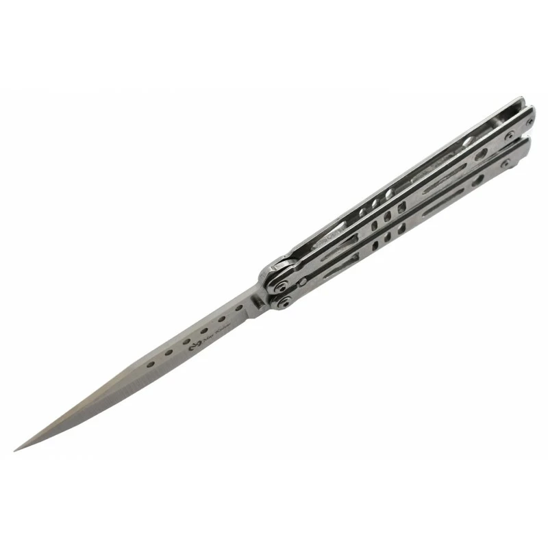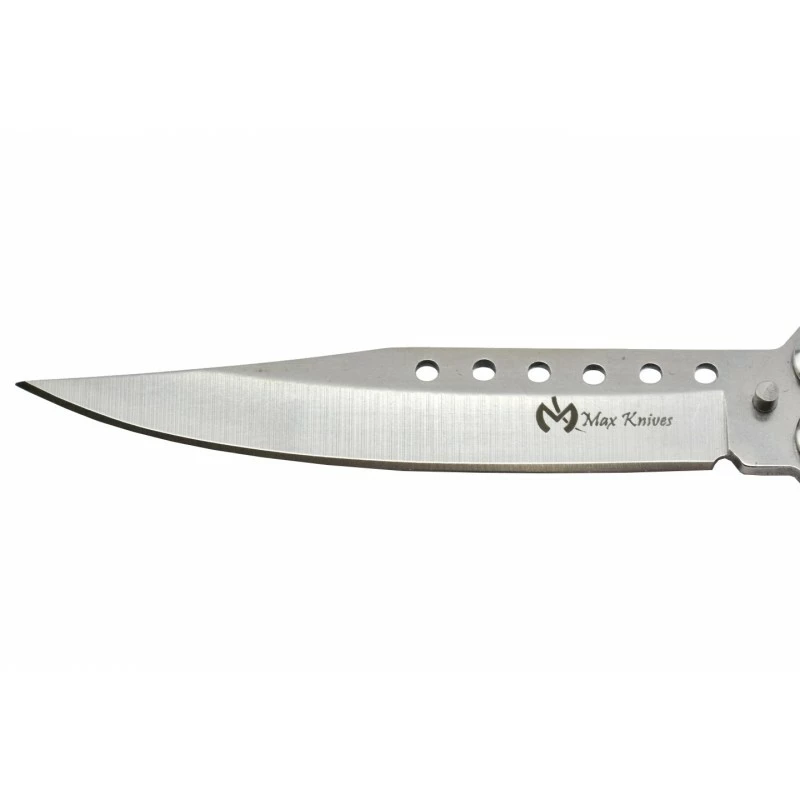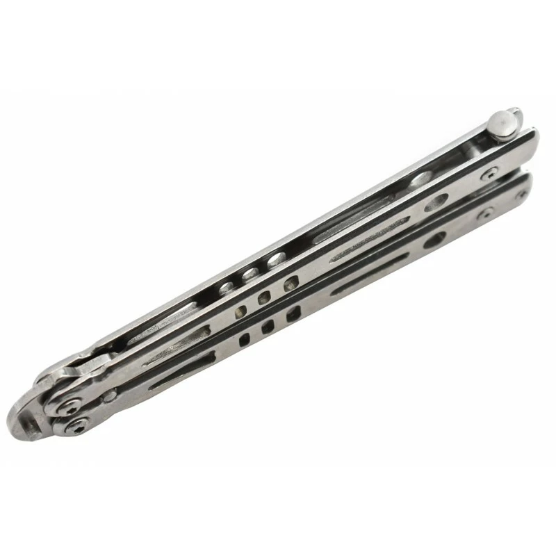 Un couteau papillon qui vaut le coup d’œil ! Même s’il ne coûte pas cher, le Max Knives P52S ne manquera pas de vous surprendre grâce à son esthétisme fortement travaillé. Le manche en acier inoxydable est agrémenté d’ajours de diverses formes, avec un aspect symétrique d’une branche à l’autre. Car il ne faut pas oublier qu’un balisong se compose d’une poignée divisée en deux parties mobiles, bien sûr le P52S Max Knives ne déroge pas à cette règle.
