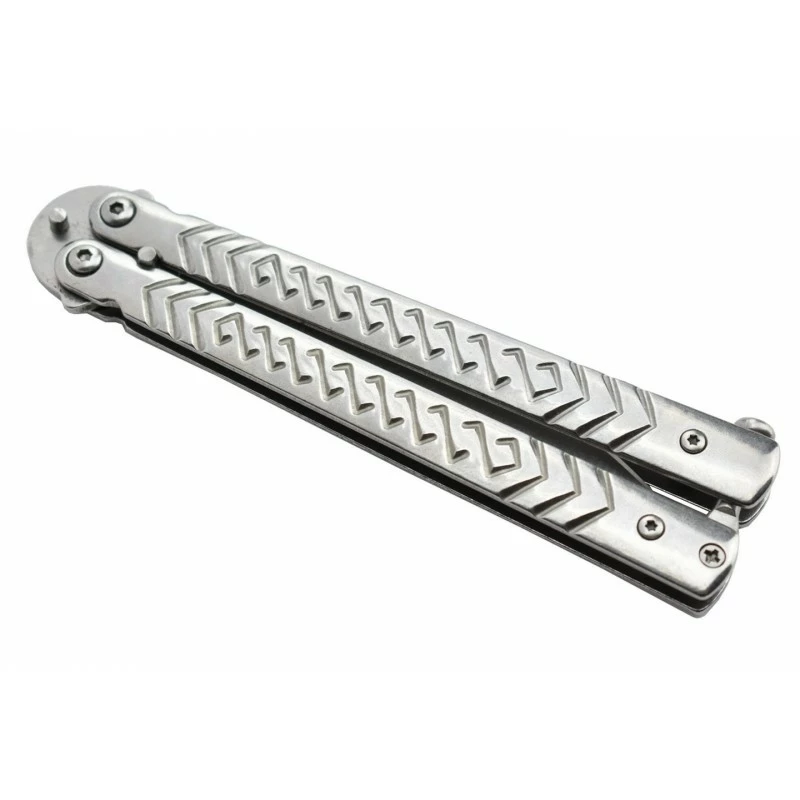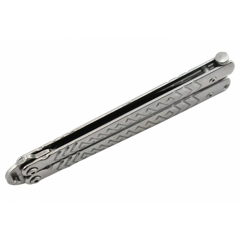 C’est la marque Max Knives qui est à l’initiative du modèle P54S, un couteau papillon tout inox joliment décoré. Autant dire qu’il ne craint pas l’oxydation, ou encore la rouille. Balisong oblige, son manche se sépare en deux parties au moment de l’ouverture, elles sont toutes les deux décorées par des motifs rectilignes attrayants. Des segments de droite qui sont positionnés de façon harmonieuse, et qui rendent les utilisations plus agréables. Longueur du manche : 117mm, pour pouvoir transporter le couteau papillon où vous voulez, quand vous voulez.