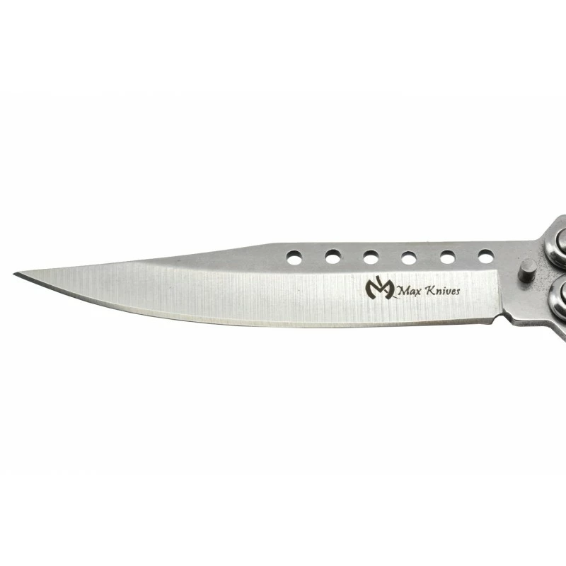 Le Max Knives P54S est un balisong élégant jusqu’à la pointe de sa lame qui est ajourée à six reprises par de petits cercles. Elle est de couleur grise et fabriquée en acier inoxydable 3Cr13, sans oublier de mentionner la présence du logo Max Knives de couleur sombre pour le contraste. Si vous préférez les couteaux papillons noirs, sachez que le Max Knives P54S se décline également en version “black”.