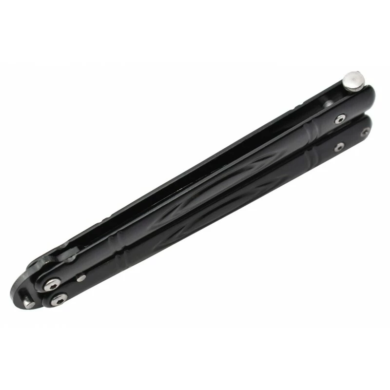 Le couteau papillon Max Knives P55B a un manche en acier noir finement décoré, avec le plus grand soin. La poignée est donc très raffinée et ne manquera pas de vous épater à chaque coup d’œil. En position refermée, le balisong mesure 117mm ce qui assure des manipulations très agréables mais surtout une facilité de transport certaine. Également disponible en version gris silver.