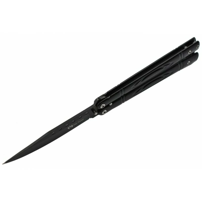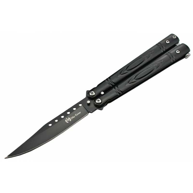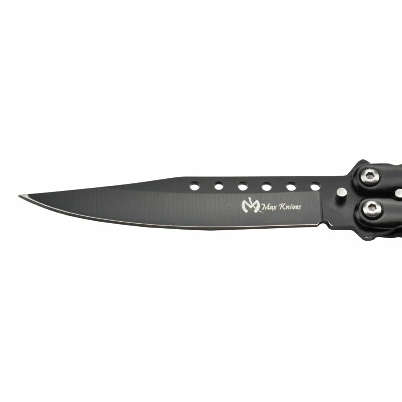 Au vu de son excellent rapport qualité/prix, le Max Knives P55B est idéal pour débuter l’aventure “balisong”. Ce couteau papillon est entièrement conçu en acier inoxydable avec revêtement noir, et résiste ainsi parfaitement à la corrosion/rouille. Fabriquée en acier 3Cr13, la lame est ajourée par six petits trous sur la partie haute, et enrichie du logo Max Knives de couleur claire afin d’attirer le regard. En supplément, il est possible d’ajouter la gravure d’un texte au choix. Longueur de la lame : 98mm.