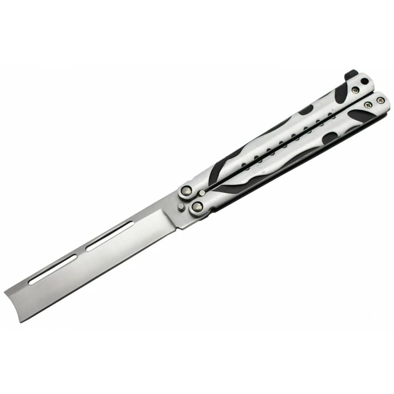 Séparable en deux parties comme n’importe quel balisong, ce couteau papillon a ici des poignées en aluminium s’avérant être agréables à prendre en main. Elles sont majoritairement argentées ainsi que noires afin d’offrir un beau spectacle visuel au moment des utilisations. Le manche mesure 13cm de longueur si bien que le couteau papillon n’aura aucune difficulté à se loger dans la poche ou dans le sac, pour vous suivre au gré de vos déplacements quotidiens.