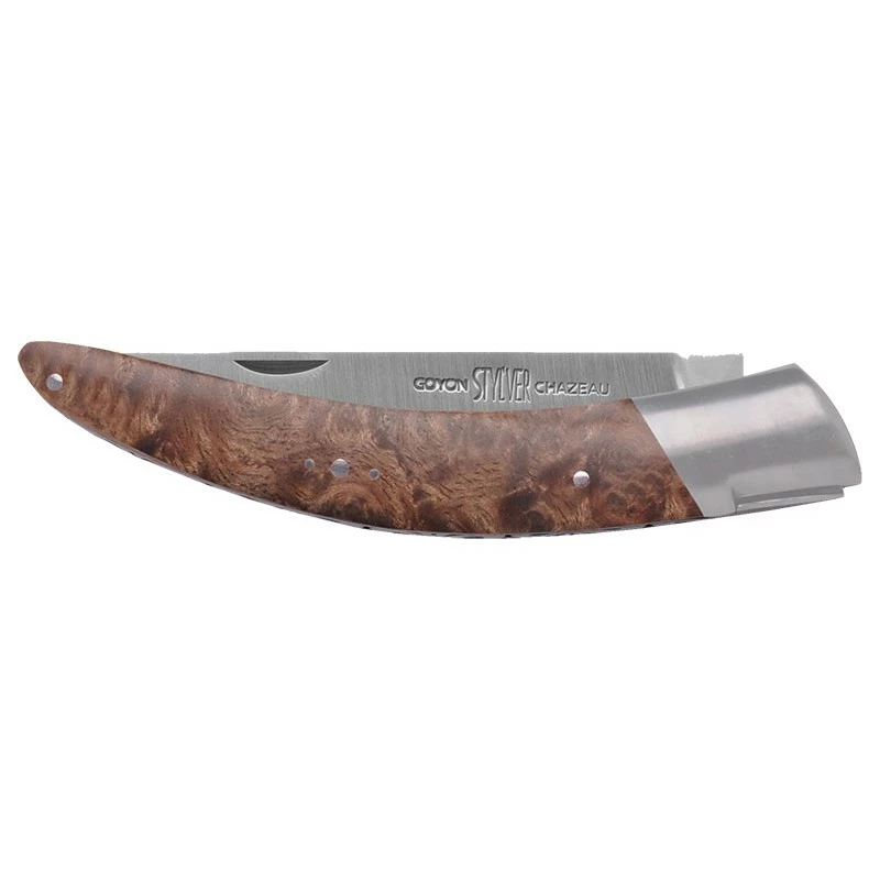 Le Stylver est un couteau de poche 100% français fabriqué par la coutellerie Goyon Chazeau localisée à Thiers. En s’inspirant des couteaux méridionaux, les artisans ont voulu lui conférer une ergonomie incomparable et un charme particulier balançant entre contemporanéité et tradition. Ce couteau pliant est équipé d’un manche courbé d’une longueur de 95mm, conçu en ronce de noyer. Ce dernier offre à l’utilisateur une prise en main parfaite de l’outil coupant pour des performances optimales. Monté par rivets, il est aussi agréable à regarder que robuste. Autres caractéristiques, une mitre massive en acier inoxydable et le ressort sur le dos à la finition incomparable, ciselé par les artisans eux-mêmes. Le couteau fermant Stylver est doté d’une lame à cran forcé en acier inoxydable Sandvik 12C27 pour une capacité de coupe et une dureté élevées. Celle-ci mesure pas moins de 120mm de long et se déploie par le système d’ouverture nail nick. Pour favoriser son transport, un étui en cuir pleine fleur de couleur marron est inclus.