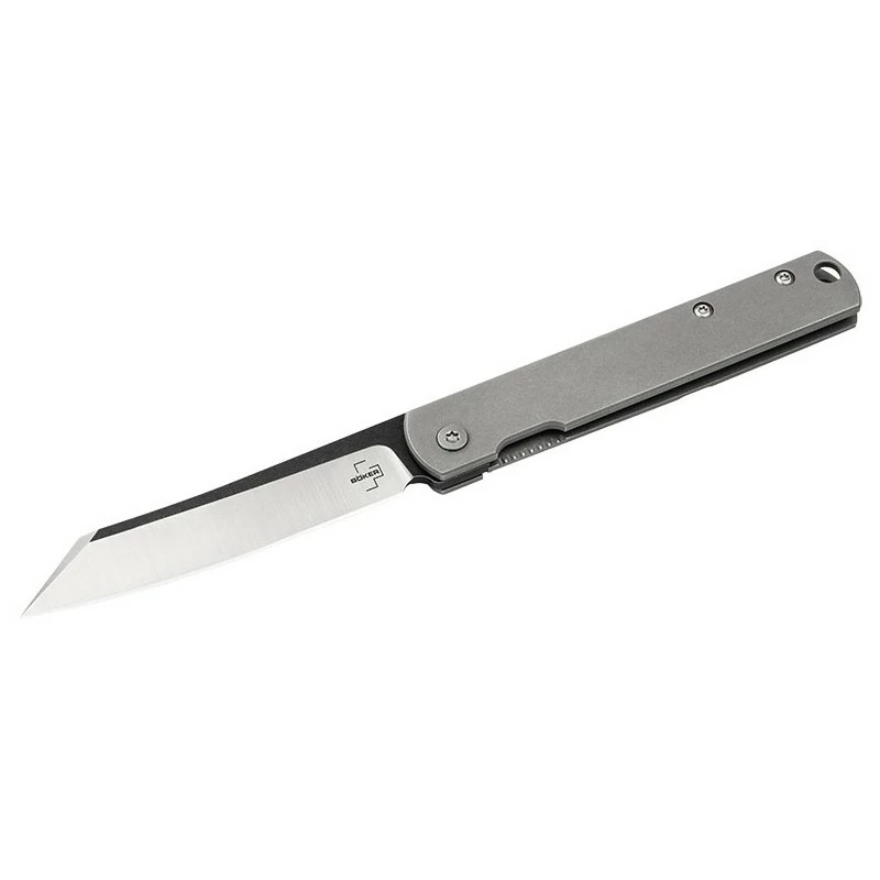 Le Böker Plus Zenshin rappelle les célèbres couteaux de poche Higonokami, mondialement connus, qui sont fabriqués dans la ville japonaise de Miki depuis 1896. Contrairement à ses modèles historiques, cependant, le manche du couteau n’est pas fabriqué à partir d’une seule pièce de métal plié, mais à partir de plaquettes en acier inoxydable plat avec une finition mate stonewash. Le design plat se passe de doublures supplémentaires et tient confortablement dans la main. La lame en 440C est fournie avec une finition bicolore élaborée et une rectification plate. Elle est efficacement verrouillée par un mécanisme Frame Lock sûr. Avec trou pour dragonne.
