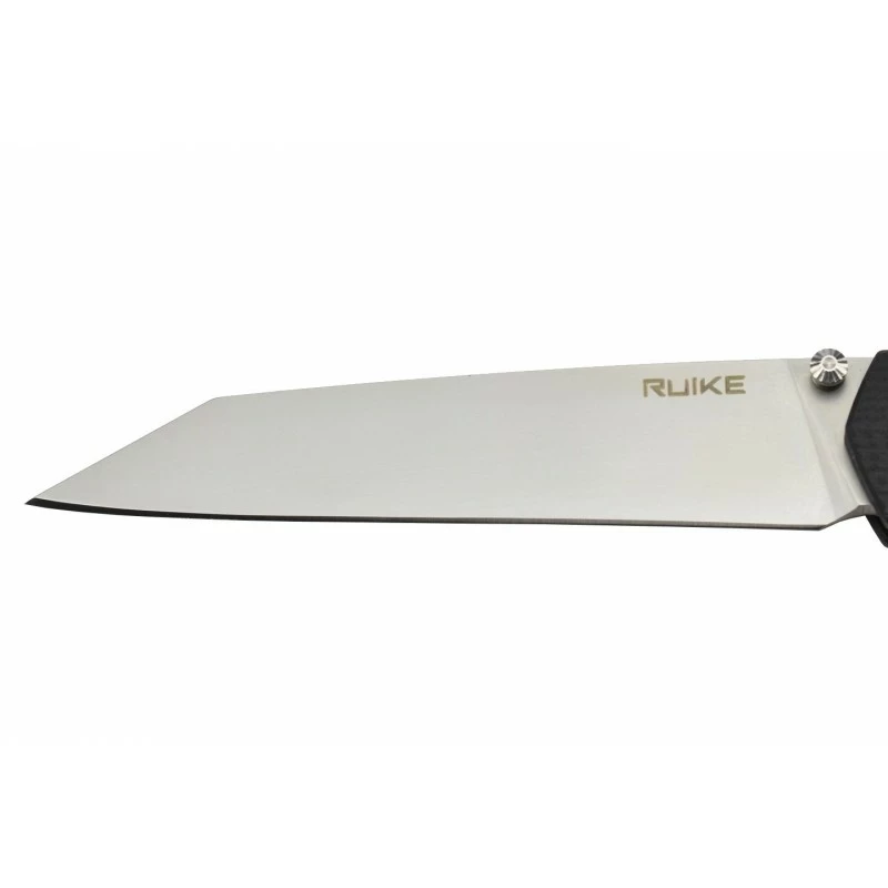 Le Ruike P865-B est un couteau pliant type EDC qui ne manque pas d’allier élégance et fonctionnalités. Il possède une lame droite, biseautée, mesurant 91mm de longueur, avec une fabrication en acier inoxydable Sandvik 14C28N. Le traitement cryogénique permet à la lame d’obtenir une excellente dureté (environ 58-60HRC). La lame drop point, à la finition mate, est décorée par l’inscription Ruike, elle peut également être gravée par un texte au choix, et ce, au niveau des deux faces. L’ouverture s’effectue manuellement grâce au bouton thumb stud.