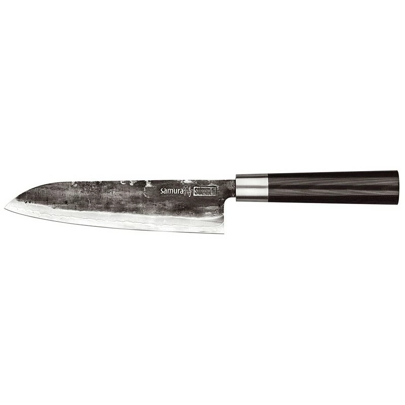 Dans la série Super 5 de chez Samura, voici le couteau Santoku. Avec son style sobre et chic, cet ustensile tranchant haut de gamme éclaboussera votre cuisine par sa beauté mais aussi par sa faculté à faciliter la préparation de vos mets ! Vous ne pourrez qu’apprécier l’incroyable polyvalence de sa lame de 18.2 cm de long qui est en mesure de réaliser toutes les découpes dont vous aurez besoin. Celle-ci est fabriquée en VG-10, acier riche en carbone qui offre une excellente résistance à l’usure et à la rouille. Son manche de 14cm est en micarta. Sans compter son bel aspect, il garantit une prise en main agréable et aisée favorisant l’exécution de tâches de coupe précises.